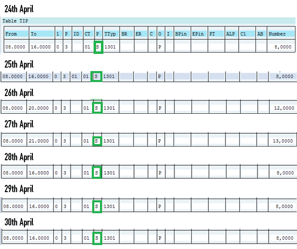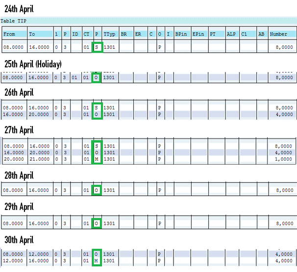 Figure 5) worked by the employee in a week are entered and saved in infotype 2002. Hours worked on April 24, 25, 28, 29, and 30 account for 8 hours each (08:00 to 16:00) for a total of 40 hours. Hours worked on April 26 are 12 and on April 27 are 13, which account for the additional 25 hours. Thus, the total hours worked for the week are 65.