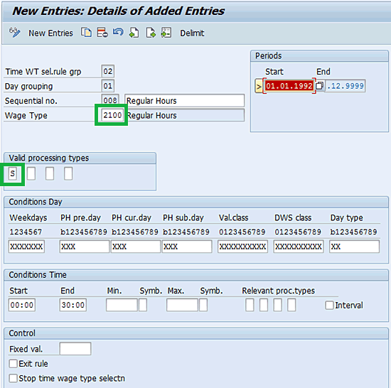 Entry in table T510S to generate wage type 2100 for processing type S