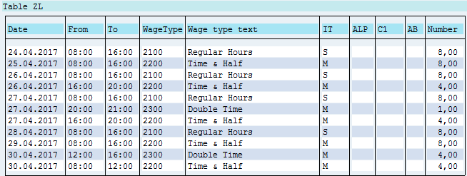 - The next three columns are the daily regular, time-and-a-half, and double-time hours. They map to the time wage types that are generated by the time evaluation program (using custom schema and PCRs) to hold the daily totals of these hours. These hours are passed on to payroll to generate amounts for payment.