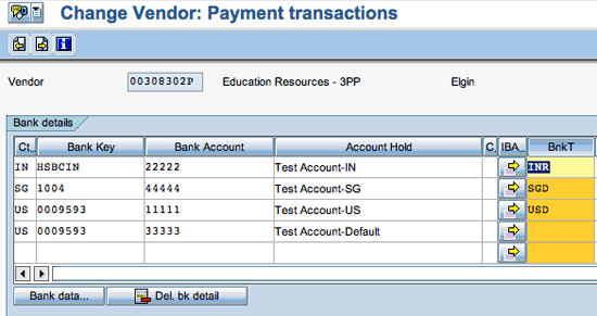If the bank type is blank for multiple bank accounts, then the system looks for the first bank account with the blank bank type in the vendor master to use as the default. You are not required to define the text values -- in my example, INR, SGD, and USD -- elsewhere in your SAP system. The field allows any value up to a length of four characters. I’ll demonstrate the use of bank type with vendor invoice later on.