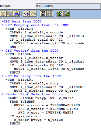 Step 3. Amend field E_RBKPV-BVTYP in the user exit (Figures 9 and 10) and write the partner bank type value to it. In Figure 11, you can see the ABAP code that I used to amend the E_RBKPV_BVTYP in the user exit to write the partner bank type value.