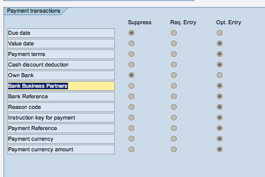 You can use the BnkT (bank type) field in the vendor master to enter text differentiators for identifying the vendor’s bank accounts. If you leave the bank type field blank against a bank account in the vendor master, then it serves as the default bank if bank type information is missing in the vendor invoice. You may want to leave this field blank if the vendor has only one bank account and you want the system to select that bank account for all payments.