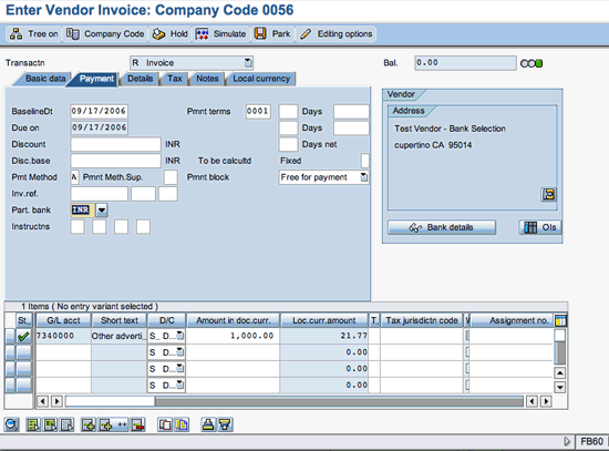 You can create a vendor invoice in the system in multiple ways. I’ll address the three methods of vendor invoice creation and the ways to use the partner bank type functionality in the following sections so you can make the payment to the selected bank of the vendor if the vendor has multiple bank accounts.