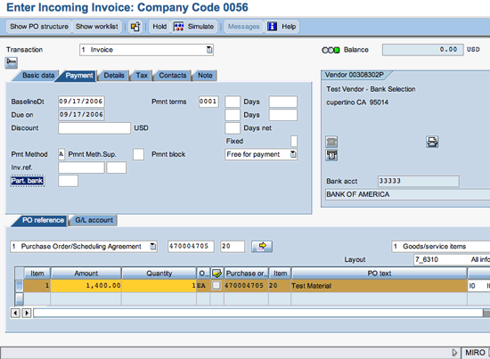 After entering transaction MIRO, enter the company code in which you are going to post the invoice using menu path Edit > Switch Company Code, or by pressing the F7 key. Provide the invoice date, posting date, and reference in the Basic data tab. In the PO reference tab on the bottom pane of the screen, provide the purchase order details (Figure 6). Provide the partner bank type details in the Payment tab. Click on the save icon to post the documents. I left the Part. bank (partner bank type) field blank in this example to demonstrate the use of the default bank account later on. I’m using default bank account 33333 from Table 1 here. You need to use transaction MIRO to create this invoice in this method because you are creating it with reference to a PO. The accounting document contains the payment information in the Part. bank field.