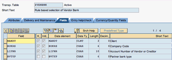 Step 1. Check for conditions in which you want to populate the partner bank type. My example makes the bank account selection based on company code currency, so a simple check here would be to ensure that the vendor master exists in multiple company codes. If the vendor master doesn’t exist in multiple company codes, then you don’t need to use the bank type field.