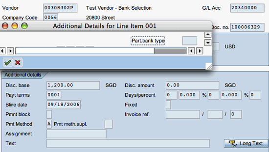 Select the invoice document (Figure A) using the selection parameters upon entering transaction code FBL2N. Then provide the value for the partner bank type field that you found in the New Values pop-up window. The partner bank type field acquires the new value in the vendor invoice document (Figure C).