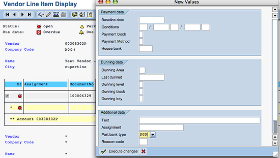 To perform mass maintenance, use transaction code FBL2N. Enter the selection parameters in transaction code FBL2N to select those documents for which you need to maintain the partner bank type field. Follow menu path Environment > Mass Change > New Value, which produces a pop-up window (Figure B). Enter the new value of the partner bank type SGD in the Part.bank type field and click on the Execute changes button.