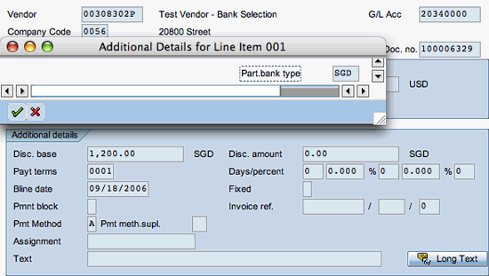 I’ve created an example of a vendor invoice created with a blank partner bank type to demonstrate how you can perform mass maintenance on the Part.bank type (partner bank type) field even after you have posted the vendor invoice (Figure A). I created the invoice using transaction code MIRO. Note that in Figure 1 I left the Part. bank field blank intentionally to demonstrate the mass maintenance functionality. This case is similar to the one shown in Figure 7 in the main article in terms of the creation of the invoice. However, I changed the bank type value in this case from blank to SGD using mass maintenance, so I can use bank account 44444 for payment (Table 1 in the main article).