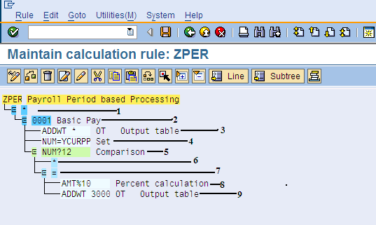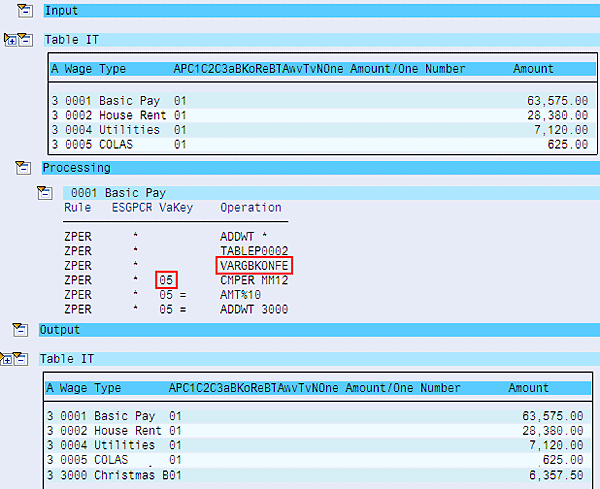 On the other hand, PCRs are a collection of operations generally used to manipulate the wage type fields, such as AMT (amount), RTE (rate), and NUM (number). Some operations are used to retrieve specific data from an employee’s master data based on which you can make your own decision flows. OUTWP, VAKEY, and ADDWT are a few examples of SAP payroll system operations. In transaction code PE04 you can see the ABAP code associated with every operation, so custom operations can also be made with ABAP forms starting with op.