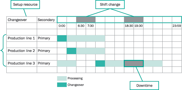 scheduling heuristics or the optimizer cannot schedule changeovers or schedule the setup during a shift change