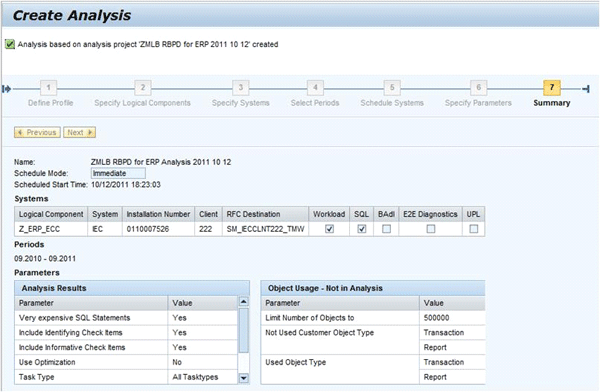 Access the SDA, select your analysis project, and click the Create button under Analyses based on Analysis Project ‘ZMLB RBPD for ERP 2011 10 12’ (Figure 12). A pop-up screen opens for you to begin defining your analysis. Enter a Name for your analysis and select the Schedule Mode as Immediate if you are analyzing a non-productive system or Schedule to run the analysis during off-hours against your production system. Then click Next.