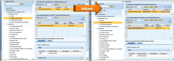 You can optionally add your own check steps. You need to create them in the Rule Database in the SDA work center to make them available for assignment in your project structure. Choose Edit to select the structure object to which you want to attach them (Figure 11). You can assign the check steps to a structure object as identifying (i.e., will be used to activate the structure node) or informative (i.e., do not affect activating the structure node); however, they must be available in the Rule Database first.