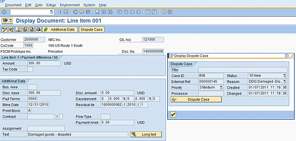 - While displaying document 1400000056, you can see the Create Dispute Case button. You can create a dispute case manually for each document from transaction code FB03, but you will create a dispute case automatically through an SAP-delivered program. Creating a dispute case with an automatic dispute-case creation program enables you to create dispute cases on a mass basis when the volume of payment is large. Automatic creation of dispute cases also helps companies increase efficiency of dispute handling and reduce the chance of error owing to manual creation of dispute cases in the system.