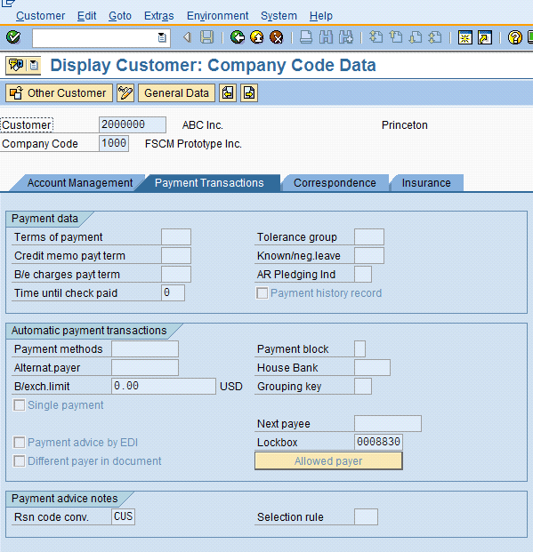 Next, you need to assign the reason code conversion version to the customer to facilitate the reason code conversion while applying the customer payments. The Rsn code conv. field is available in the Payment Transactions tab of the company code segment of the customer master data. Enter CUS in the Rsn code conv. (reason code conversion) field, as shown at the bottom of in the screen in Figure 4.