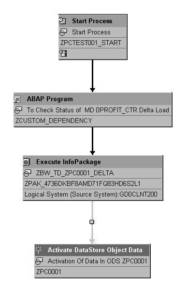 In the prompt, create a new process chain variant, which in our case is ZCUSTOM_DEPENDENCY. The screen in Figure 10 appears. Enter the custom program ZBW_DEPENDENCIES in the Program Name field. Then, in the Program Variant field, enter the variant that you created for this InfoPackage load, in our example PCA_DELTA_1. When you finish, your process chain should resemble the one shown in Figure 11.