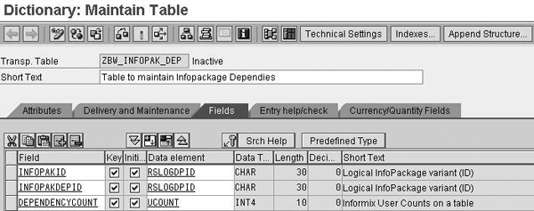Step 2. Create a custom table in transaction SE11 to map and store the dependencies. Check with your Basis team to make sure you have the necessary authorizations to create and maintain custom tables in transaction SE11. In our example, we named the table ZBW_INFOPAK_DEP. The table contains three fields: INFOPAKID, INFOPAKDEPID, and DEPENDENCYCOUNT (Figure 2).