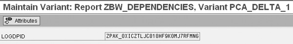Go back to transaction SE38 and enter your program name, in our example ZBW_DEPENDENCIES (Figure 5). Then select Variants and click on the Change button. This takes you to the screen to create a variant (Figure 6). Values is selected by default. Enter a variant name, such as PCA_DELTA_1, and click on the Create button. The Maintain Variant screen appears (Figure 7). Enter the InfoPackage ID from Figure 3 in the LOGDPID field. This is ZPAK_0XICZ*, as explained in step 2. Save your settings.