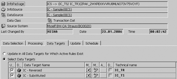 You could execute loading activities from steps 1 and 2 by one InfoPackage (Figure 3). Perform the same activities as instructed in step 1: Select the InfoSources in the Modeling window of Administrator Workbench. Find the 8ICS InfoSource, select it, right-click, and choose Create InfoPackage. Fill the InfoPackage Description field in the initial screen and click on the save icon to get to the screen in Figure 3. Execute the InfoPackage by clicking on the Start button in the Schedule tab sub-screen. Figures 4 and 5 illustrate the result.