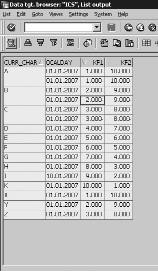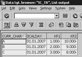 Don’t forget that this approach applies for summation aggregation key figures. Figure 12 shows how the minimum (Test KF-MIN) and maximum (Test KF- MAX) aggregation key figures act. As you can see, records for A, B, and C characteristic values did not eliminate from the InfoCube because of non-summation key figures (Figure 13).