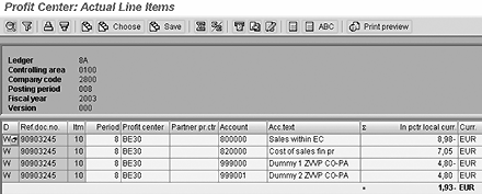 Figure 7 shows the profit center document for the customer invoice. The column Profit center shows to which profit center the revenue is allocated. You can see that the correct profit center BE30 has been used. This is the correct profit center because the Belgian company is invoicing the customer; therefore, the revenue must be posted on a Belgian profit center.