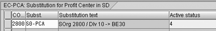 In Figure 6, two criteria must be met: the sales organization (field PCASUB-VKORG) must equal 2800 and division (field PCASUB-SPAR2) must equal 10. If these two criteria are met, then the value of profit center is set to BE30. Once the substitution is created, the substitution must be activated with transaction 0KEL. (Figure 9.)
