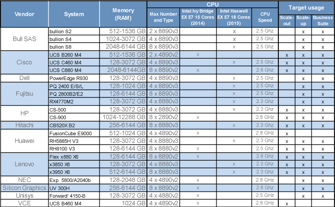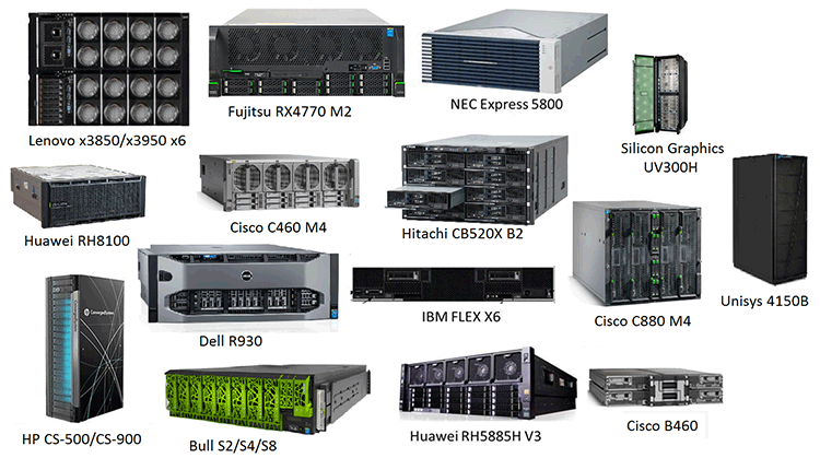 A major consideration for the on-premise approach would be to make sure that your hardware fits into your existing chassis, racks, power outlets, cooling plan, and the outlay of your data center. For example, many are not aware that some of the larger SAP HANA systems, such as Lenovo’s x3850 x6, require a four-rack unit (U) height in a data center, but if you use Lenovo’s x3950 x6, you need to double that size requirement (since that is basically two stacked 3850s). Other products, such as Cisco’s C880 M4 server, require a 10U height. Therefore, it is very important to decide what hardware deployment options you are going with. As of September 2015, the most common forms of certified hardware are shown in Figure 1 and described in Table 1.