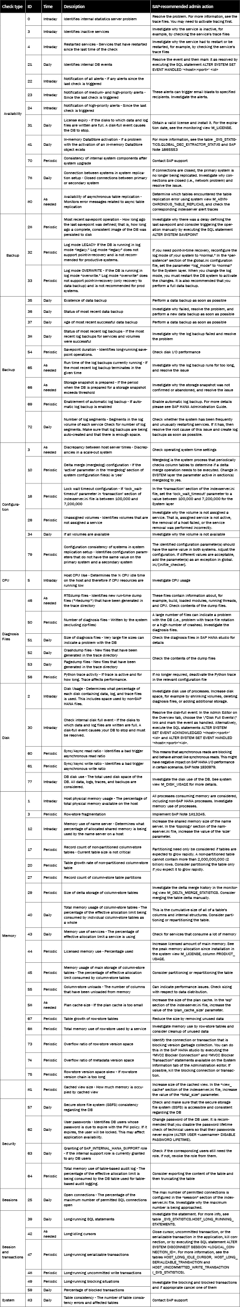 To get started, take a look at Table 5 as the first step of your own tailored daily SAP HANA admin SOP. In this table you find all the available SAP HANA automated alerts, alert IDs (so that you can find them in SAP HANA studio), the suggested frequency when these alerts should be activated or monitored, descriptions, and SAP’s official recommendation on how to resolve any issues.