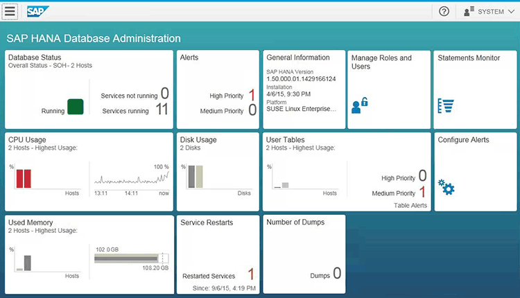 The customization of this application is a simple click-and-drag of the tiles (much like on your cell phone). You can also choose the refresh rate of the information in the SAP HANA cockpit. The application can run on a web browser and is therefore mobile and simple to deploy. The SAP HANA cockpit also has a Manage Databases app that allows you to monitor single and multi-tenant databases in SAP HANA.