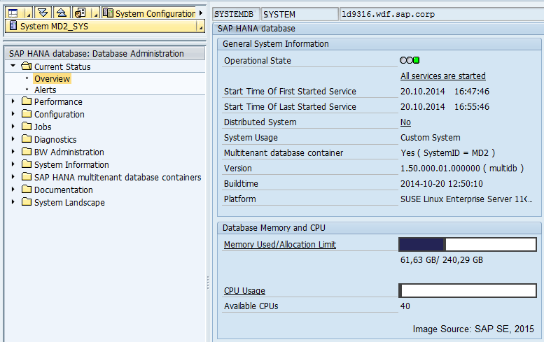 In SAP HANA studio in the administration perspective, you get access to most database and system information. There are several tabs that displays landscape, alerts (automatic scheduled monitoring jobs), performance statistics, disk volume information, configuration settings, overall system information, diagnostic files, and configuration of traces and trace files (Figure 2).