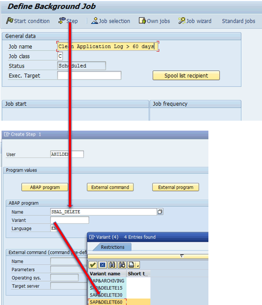 In addition to the tips mentioned above, to keep the application log tables small, you should use transaction code SM36 to schedule a job to run periodically. In the screen shown in Figure 11, click the Step button to define which program the job will run (pick SBAL_DELETE). After that, you can also choose a variant to decide how much data you want to keep. For example, in Figure 11 I delete case logs older than 60 days.