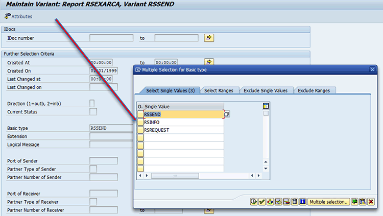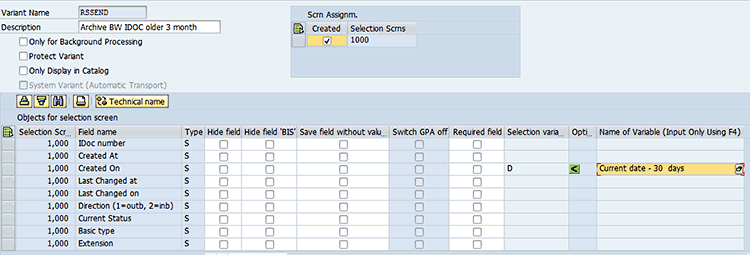 Finally, you select the Created on line and pick the variable Current date – 30 days as seen in Figure 15. This archives all IDocs with a message type RSSEND that have a create date that is more than 30 days old. Naturally, you can select other retention periods in the variable selection (i.e., 60/90 days).