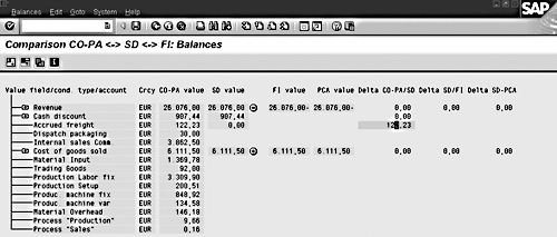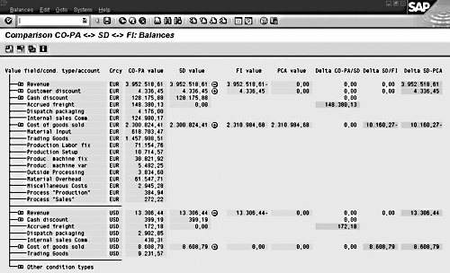 Looking more closely, note the entry of $122.23 in the delta column for accrued freight. This means that the CO-PA database contains an entry for $122.23 that was not recorded in the SD data tables. Look back at the billing condition table to confirm that the freight entry is not there.