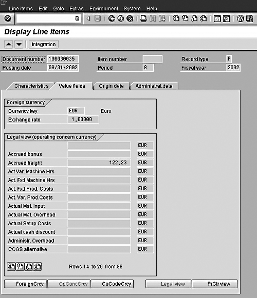To find the posting in CO-PA, click on the profitability analysis document to reach CO-PA line-item reporting. By scrolling through the value fields listed under the Value Fields tab, you will find the entry for Accrued freight (Figure 8).
