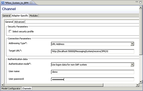 As Addressing Type, choose URL Address because SAP NetWeaver BPM can be reached under a well-defined address, https://localhost:<port>/MessagingSystem/receive/JPR/XI. Enter this URL enhanced by the port number of your Web application server installation in the Target URL field. AEX and SAP NetWeaver BPM are installed on the same physical machine, so you can use the localhost server address. In case of a cluster installation, you have to replace the localhost entry with the address of your Web dispatcher. In the Authentication data section, select Use logon data for non-SAP system from the Authentication mode drop-down list. Finally, specify the credentials for connecting to SAP NetWeaver BPM in the respective fields (User name and User password). Your configuration of the adapter is now complete.