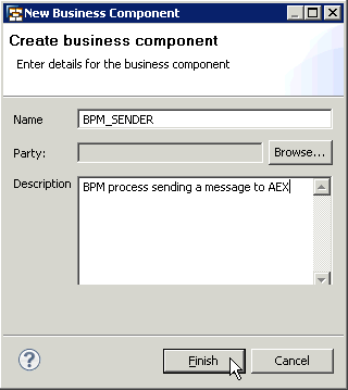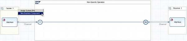 Recall from the discussion during the configuration of the automated activity (step 5) that you provided a name for the sending system in the Sender Component field of the service reference (Figure 12). The name (BPM_SENDER) has to be the name of the sender in the screen in Figure 18. Therefore, create a new business component by right-clicking the header area of the box on the left (containing the text Sender 1) and pick New Business Component from the context menu. The New Business Component dialog opens (Figure 19).