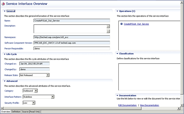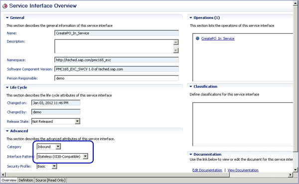 Note the settings in the Advanced section highlighted in Figure 2. Set the Category to Inbound and the Interface Pattern to Stateless (XI30-Compatible). XI30-Compatible means that the interface can contain only one operation that has to have the same name as the service interface itself. You can verify this by looking at the Operations section of Figure 2. It contains only one operation and its name is identical to the service interface name. The use of XI30-Compatible is motivated simply by a convention for AEX and SAP NetWeaver BPM that was introduced with SAP NetWeaver Process Orchestration, and has to do with the way incoming messages are handled by SAP NetWeaver BPM. Calls from AEX are processed in SAP NetWeaver BPM by the Web services runtime. The Web services runtime was already part of SAP NetWeaver BPM before the new combination with AEX and took care of all connections based on Web services (as the name obviously indicates). How can SAP NetWeaver BPM distinguish normal Web service calls from the new AEX Web service calls? Because of the aforementioned convention, AEX Web services contain a marker of type XI30-Compatible (which the normal Web services don’t have).