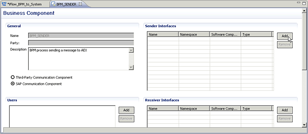 Assign exactly the same name you have entered during the configuration of the service reference in SAP NetWeaver BPM or, in other words, the name of the sending Business Component in the integration flow has to be identical to the name of the Sender Component field of the associated service reference in the BPM process model. This procedure allows the AEX engine to unambiguously identify the sender. After you click Finish, the Business Component window opens automatically. So far, AEX is only able to identify the sender, but it cannot identify the interface yet. Therefore, use the Business Component window to specify the sending interface. In this case, click the Add button in the Sender Interfaces section of the window (Figure 20).