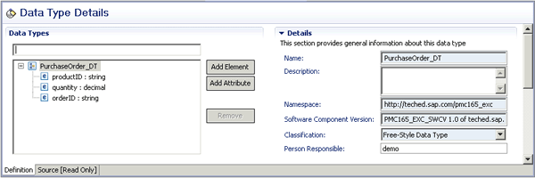 This view consists of just one input message named PurchaseOrder_MT, indicating asynchronous communication. The message is connected to a data type containing the actual message contents. Click the Associated Data Type link to bring up the message details (Figure 4).