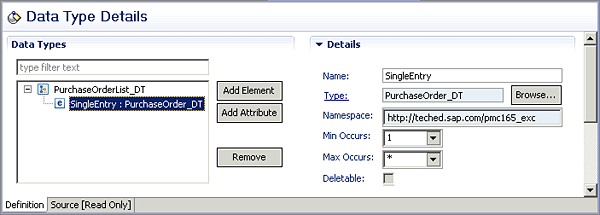 It is only necessary to set the Category appropriately to Outbound. The associated data type is shown in Figure 6. The BPM process returns a list of PurchaseOrder_DT entries as the Max Occurs parameter has been set to unbounded (represented by the asterisk in the Max Occurs field).