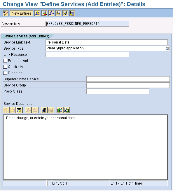 You also have additional control here to specify quick links, emphasis, disablement, service groups, and proxy class (Figure 10). Follow IMG menu path Personnel Management > Employee Self-Service > General Settings > Homepage for Self-Services > Services (Define Services, Define Country-Specific Services, and Assign Services to Subareas). In Figure 10 you can define service details (for example, Service Link Text, Service Type, and Link Resource).