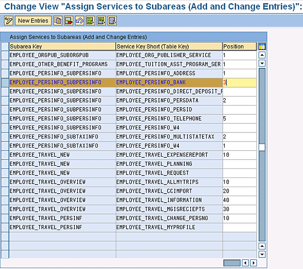 Follow IMG menu path Personnel Management > Employee Self-Service > General Settings > Homepage for Self-Services > Subareas > Define Subareas. Here we define the name on the subarea section. The subarea header in this example is Personal Information (Figure 7). On the SAP NetWeaver Portal screen, this is displayed as a header (Figure 9).