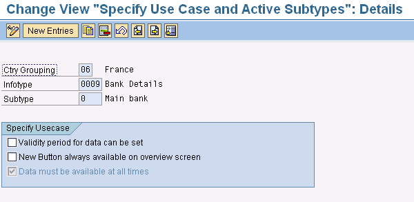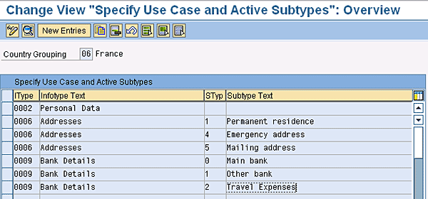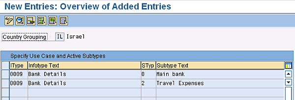 In the next step, you define subtypes to be available in the main bank and the travel expenses banks (Figure 18). These subtypes will be available for the employee to add/modify their bank details for Israel. In Figure 18, let Israel users view/create/modify only Main Bank (Subtype = 0) and Travel Expenses (Subtype = 2). In the case of France, you configure the system to let users maintain Main Bank, Other Bank, and Travel Expenses (Figure 13).