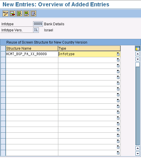 You need to look in the V-T588IT_SCREEN view to find the country-specific structure based on which country suits your need. You see in this V-T588IT_SCREEN view that the structure is different for some countries (screen versions) while XX is used for others. In this case, as there is no standard country-specific structure for France that is planned to be reused, reuse the existing generic structure, HCMT_BSP_PA_XX_R0009, for Israel (IL) (Figure 17).