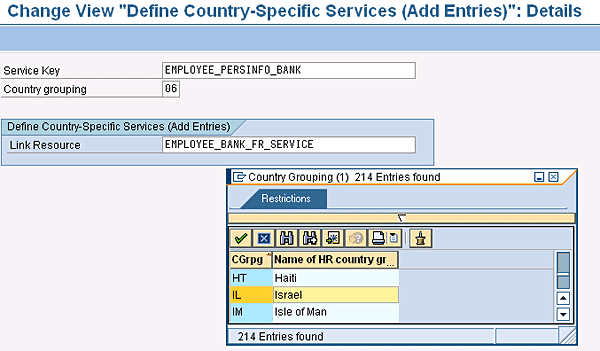 In Figure 11, you link the resource to the services for country grouping (06 = France). When the France user accesses the bank information from the SAP NetWeaver Portal, the ESS service enables the bank resource for France.