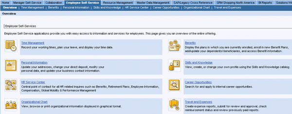 In this IMG activity, you define area pages then assign each area to an area group page and define each a position on the SAP NetWeaver Portal homepage. When the user logs on to the Portal, they see the ESS homepage Overview (Figure 3). Here the users see all the attributes they can access. Area pages contain services (Web applications) that are related to each other. Employees access an area page from an area group page.