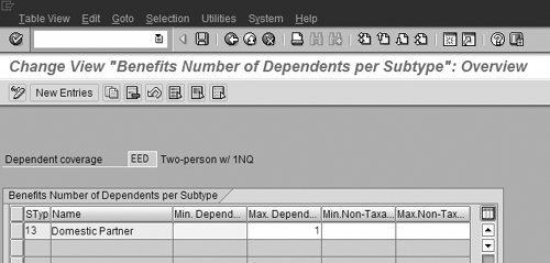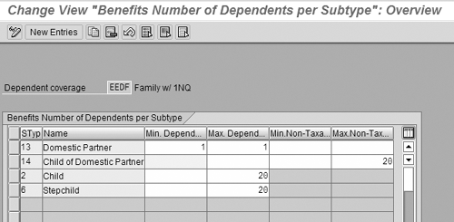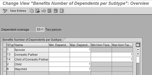 Next, configure the types of family members allowed for each dependent coverage option at IMG menu path Personnel Management>Benefits> Plans>Health Plans>Define Minimum and Maximum Number of Dependents. This new step gives you the ability to control exactly which dependent types are allowed on each coverage option. This step is key to domestic partner coverage because it prohibits selection of non-qualified dependents on the traditional coverage options. It requires selection of non-qualified dependents on the options that have a post-tax cost.