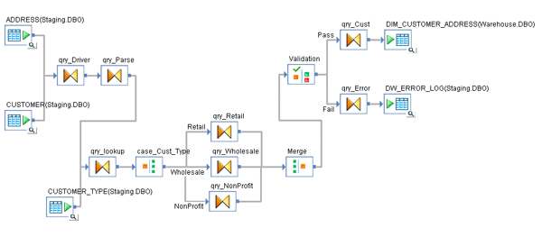 Having a good driver stage is essential for this to occur. Consider the example in Figure 2. This data flow has the following stages: qry_Driver is the driver, qry_Parse is the parsing, qry_lookup is the lookup, and case_Cust_Type and Validation are the business rule enforcement.
