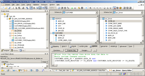 This data flow denormalizes customer and address data into a customer_address dimension in a data warehouse. The customer and address table both exceed 20 million records in the source staging database, so only changed data should be processed. Changed data is captured by including the date modified field in the where clause of the qry_Driver transform, allowing the recordset to be driven by processing data that has changed.