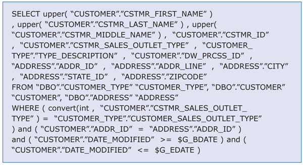 Consider the example of a combined push-down operation to the database. The data flow has two query transforms. The qry_Driver transform is the driver stage that contains the where clause that covers the delta range and only returns the changed records from the source (Figure 3). The qry_Parse query transform contains an Upper Data Services function to convert the last name field to upper case (Figure 4). In this example, the source database is SQL Server with an equivalent Upper function to convert the case of the field. SAP BusinessObjects Data Services combines both transforms operations into the SQL statement that it pushes down to the source database. Figure 5 shows the SQL statement that is pushed down to the SQL Server database from the data flow.