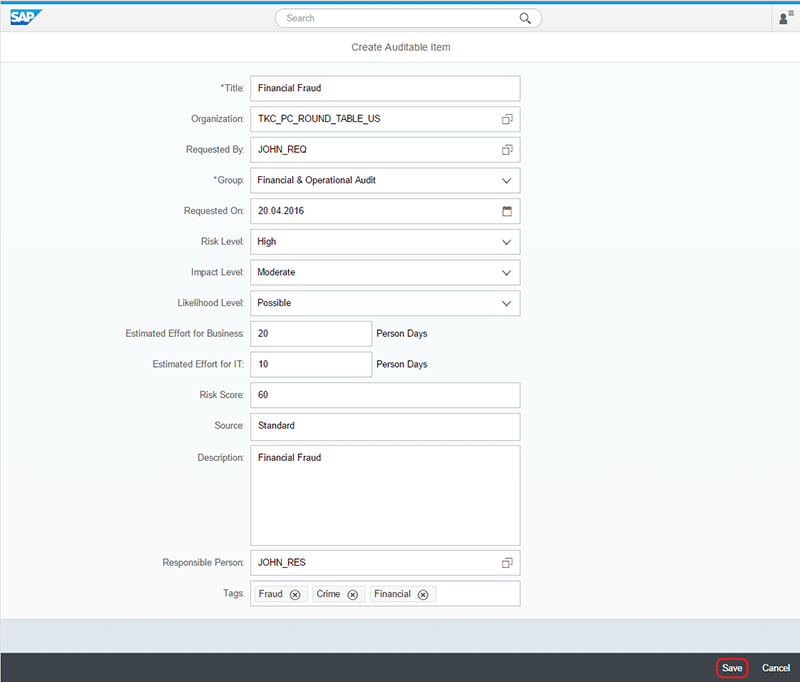 An auditable item is any definition or element of a business that can be audited. It can be a process, activity, program, or risk depending on the business environment. When an auditable item is created, it is stored centrally in the audit universe. To create an auditable item, access the SAP Audit Management Launchpad as the audit manager and choose the Create Auditable Item tile. In the screen that displays, enter values in the fields as shown in Figure 2.
